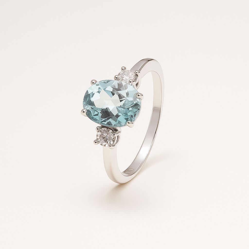 Nosso Anel Brisa é feito em ouro 18k, com gema água marinha central oval e diamantes na lateral.