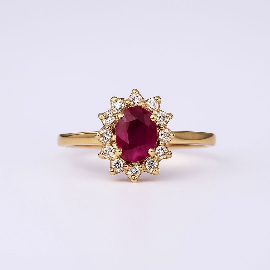 Nosso Anel Marcanã Rubi é todo feito em ouro 18k e com rubi central ao redor diamantes cravejados.